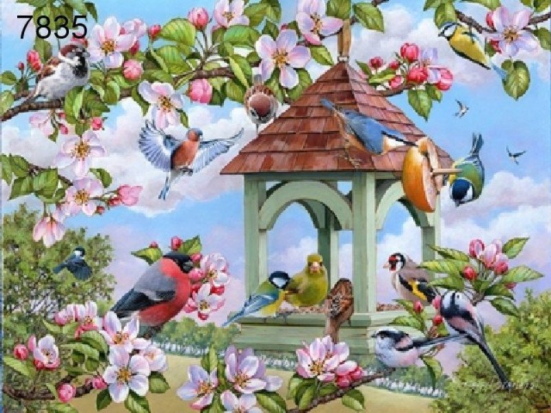 Een bont gezelschap van vrolijke tuinvogels verzamelt zich rond het voerhuisje β van roodborst tot koolmees, iedereen wil een hapje meepikken. Het tafereel is levendig en gezellig, alsof je zelf uit het raam naar de tuin kijkt.