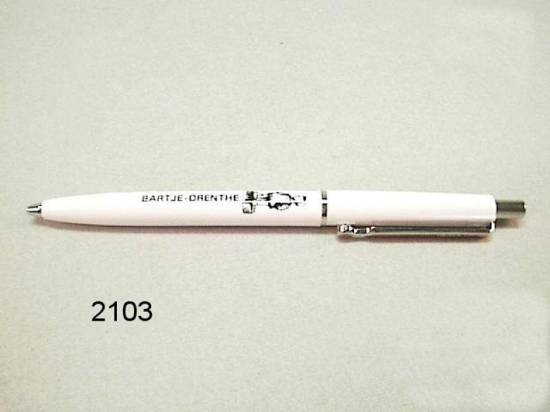 Deze witte balpen heeft een metallic clip en een drukmechanisme. Op de body van de pen staat de tekst "BARTJE-DRENTHE" samen met een afbeelding van Bartje. Dit maakt het een perfect schrijfinstrument voor dagelijks gebruik en voegt een stukje nostalgie toe aan je schrijfgerei. Deze pen is een leuk souvenir of promotioneel item.