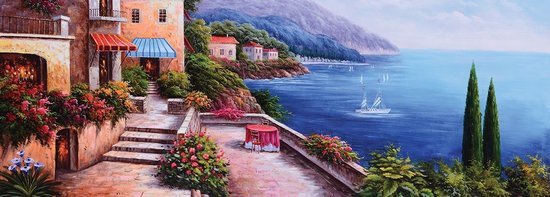 Neem even pauze… maar dan op puzzelwijze! Deze panorama legpuzzel van 1000 stukjes laat een idyllisch terras aan het meer zien, waar je de sfeer van rust en vakantie bijna kunt horen ruisen. Terwijl je stukje voor stukje de houten tafeltjes, het water en de omliggende natuur tevoorschijn ziet komen, voelt het alsof je zelf even neerploft voor een kop koffie met uitzicht.