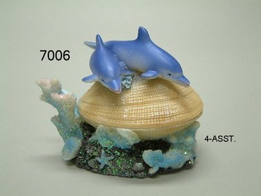 Dit prachtige opbergdoosje toont twee sierlijke dolfijnen die boven een gesloten schelp zwemmen. De schelp, die fungeert als deksel van het doosje, is voorzien van een scharnier en is gedetailleerd afgewerkt. De basis van de schelp ligt op de zeebodem en is omgeven door kleurrijk koraal en zeesterren, wat een levendige en betoverende onderwaterscène creëert. Met zijn formaat van 10x8 cm is dit doosje perfect om kleine kostbaarheden in op te bergen en is tegelijkertijd een charmante decoratieve toevoeging aan je interieur.