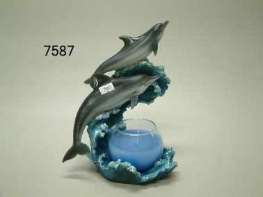 Dit prachtige beeldje toont twee levensechte dolfijnen die sierlijk op een golf zwemmen. In de golf zit een glazen houder met een blauwe kaars, wat een sfeervol licht geeft wanneer de kaars aangestoken is. Het geheel heeft een hoogte van 22,5 cm en is perfect als decoratief stuk om een nautische sfeer in je interieur te brengen.