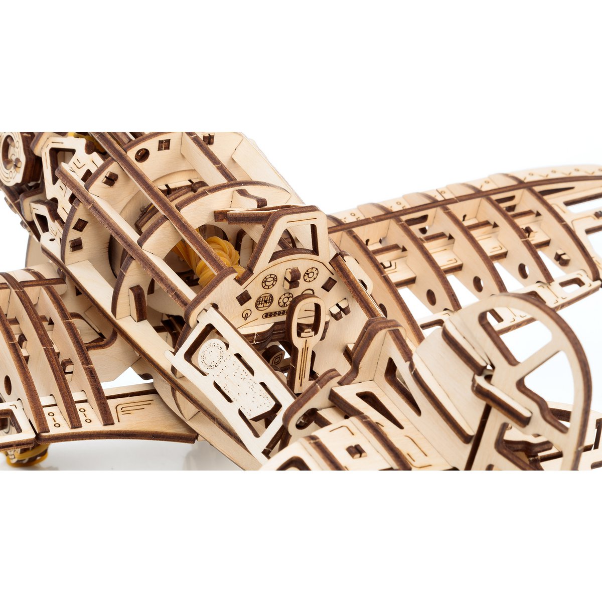 Bouw je eigen indrukwekkende dubbeldekker met de Eco-Wood-Art 3D mechanische puzzel Airplane. Dit gedetailleerde houten model combineert techniek en design in een robuust vliegtuig met zichtbare mechanische elementen.