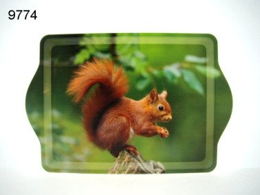 Dit rechthoekige dienblad heeft afmetingen van 21 x 14,5 cm. Het dienblad is versierd met een levendige afbeelding van een rode eekhoorn die op een stuk hout zit, tegen een groene achtergrond met bladeren. De eekhoorn is afgebeeld in een dynamische houding, wat een levendig en natuurlijk element toevoegt aan het dienblad.