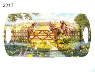 Drie nieuwsgierige ezels, een houten hek, en op de voorgrond een konijn en een fazant: dit langwerpige dienblad ademt landelijke rust. De zachte illustratie, in warme natuurtinten, maakt dit dienblad tot een charmant accent in huis. Of je het nu gebruikt om drankjes te serveren of om neer te zetten als decoratie – het brengt meteen een vleugje buitenleven naar binnen.