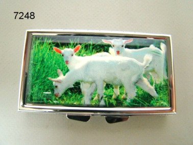Dit handige pillendoosje is gemaakt van metaal en heeft drie vakken voor het opbergen van pillen of supplementen. Het doosje meet 8 cm bij 4,5 cm en heeft een scharnierend deksel. Op het deksel staat een kleurrijke afbeelding van geitenlammetjes, afgedekt met een laagje polyresin voor extra duurzaamheid en een aantrekkelijke uitstraling. Het compacte formaat en de stijlvolle afbeelding maken dit pillendoosje zowel praktisch als esthetisch aantrekkelijk.