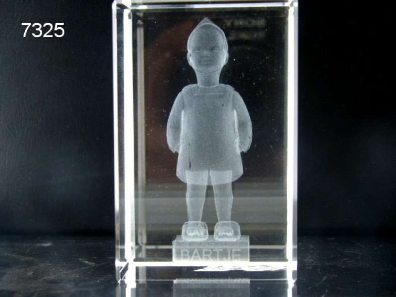 Dit prachtige glazen blokje toont een 3D lasergravure van het bekende Nederlandse jongetje Bartje. Het massief glazen blokje heeft afmetingen van 8 cm hoog, 5 cm breed en 5 cm diep. Het is perfect als decoratief stuk voor je bureau, boekenplank of vitrinekast. De gedetailleerde gravure en de mooie afwerking maken dit een uniek en sfeervol kunstwerk.