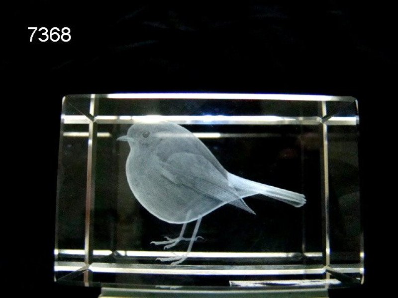 3D Laser Gravure van een roodborstje. Het vogeltje zit even uit te rusten op de grond. Ondanks dat het glas niet gekleurd is, is het duidelijk te zien dat het een roodborstje is.