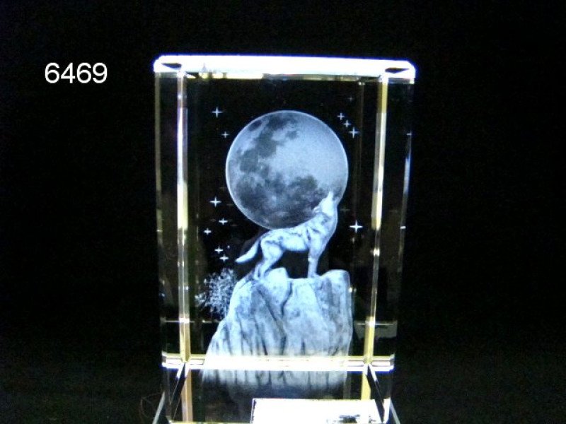 Deze indrukwekkende 3D lasergravure toont een wolf op een rots, minutieus gegraveerd in een massief glazen blokje. Dankzij de hoogwaardige lasertechniek lijkt de afbeelding te zweven in het glas, met een prachtig diepte-effect dat vanuit elke hoek zichtbaar blijft.