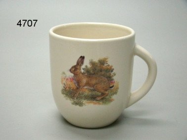 Deze kleinere mok is gemaakt van porselein en heeft een afmeting van ongeveer 8 cm hoogte. Op de mok is een afbeelding van een haas afgebeeld. De mok is perfect om je favoriete drankje te serveren en voegt een charmante, landelijke uitstraling toe aan je tafel.