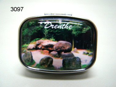 Dit charmante pillendoosje is een prachtig aandenken aan de regio Drenthe. Het doosje heeft een scharnierend deksel waarop een foto van een indrukwekkend hunebed te zien is, een typerend prehistorisch monument uit Drenthe. Bovenaan de afbeelding staat trots het woord "Drenthe", wat de regionale trots benadrukt.