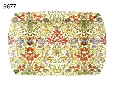 Dit dienblad heeft een klein, rechthoekig formaat met afgeronde hoeken. Het is gemaakt van duurzame melamine en heeft een prachtig symmetrisch bloemenpatroon. De afbeelding toont verschillende bloemen en bladeren in tinten van groen, rood, oranje en blauw, die in een spiegelbeeldige opstelling zijn gerangschikt. Dit dienblad is ideaal voor het serveren van drankjes en snacks, en voegt een vleugje kleurrijke elegantie toe aan je tafelsetting.