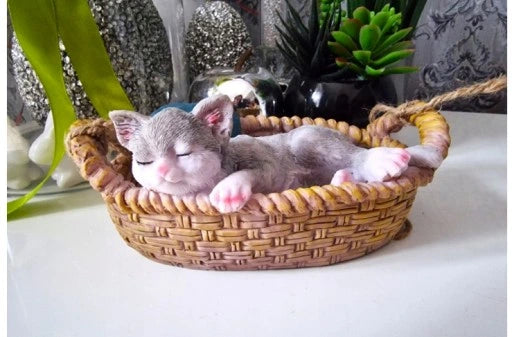 Decoratief Beeldje – Kat in Mand (17 x 8 x 10 cm) Dit beeldje van een kat in een mand is gemaakt van hoogwaardige kunststof en is hol van binnen, waardoor het stevig maar licht blijft. Elk afgietsel wordt met zorg verfijnd en vervolgens met de hand beschilderd, waardoor ieder exemplaar uniek is.