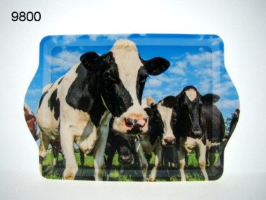 Dit charmante, kleine dienblad is een perfecte toevoeging aan elke landelijke keuken of als een uniek cadeau voor de liefhebber van het boerenleven. Het dienblad is voorzien van een prachtige kleurrijke print van koeien die vredig staan in een grasveld onder een blauwe hemel met enkele wolken. De koeien zijn voornamelijk zwart-wit, wat een klassiek en aantrekkelijk contrast creëert.