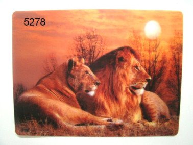 Afmetingen: 39,5 x 29 cm Materiaal: Gelamineerd papier Design: Geprinte illustratie van een leeuw en leeuwin in 3D, natuurlijke achtergrond met zonsondergang of zonsopgang