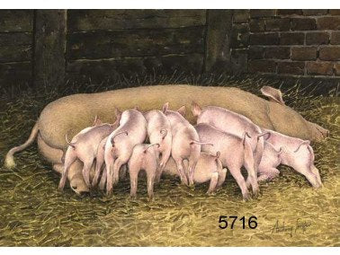 De wenskaart Legs Eleven toont een intiem en rustiek tafereel van een zeug die ligt in een stal, omringd door vers stro. Ze ligt ontspannen, haar lichaam uitgestrekt over het zachte stro, terwijl haar elf biggen zich gretig aan haar vastklampen om te drinken. De stal heeft een warme, landelijke sfeer, met lichte schaduwen die door de houten balken vallen, wat de rustieke charme van de omgeving versterkt. Het tafereel straalt een gevoel van zorg en tederheid uit, perfect voor liefhebbers van het boerenleven en moederlijke liefde.