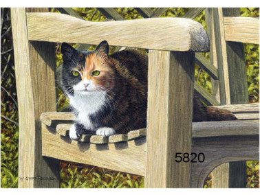 De wenskaart Mango toont een close-up van een lapjeskat die ontspannen op een houten tuinstoel zit. De kat heeft een prachtige vacht in verschillende kleuren, oranje, zwart en wit, wat haar een uniek en levendig uiterlijk geeft. Haar groene ogen kijken rustig in de richting van de kijker, terwijl haar zachte vacht comfortabel op het houten oppervlak rust. De houten tuinstoel heeft een rustieke uitstraling, met verweerde planken die de landelijke sfeer versterken. Het zachte licht valt op de kat, waardoor haar speelse en serene aard mooi wordt benadrukt. Deze kaart straalt een warme, huiselijke sfeer uit, ideaal voor kattenliefhebbers en degenen die van de rust in de tuin genieten.