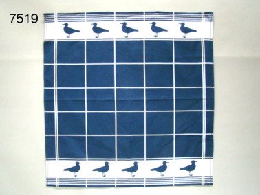 Afmetingen: 60 x 60 cm Materiaal: Katoen Design: Mooie blauwe theedoek met een ruitpatroon van witte lijnen. Langs de boven- en onderrand bevinden zich witte stroken met een herhalend patroon van meeuwensilhouetten in blauw.