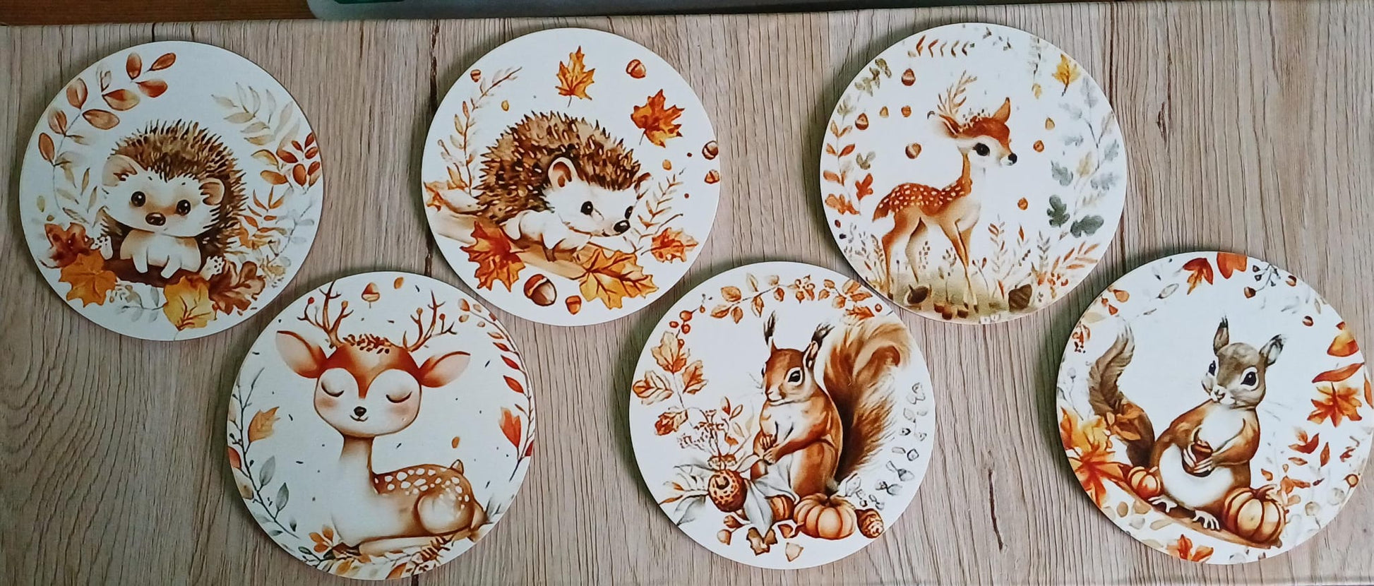Set van 6 onderzetters met herfstdieren (2 eekhoorns, 2 egels, 2 hertjes)