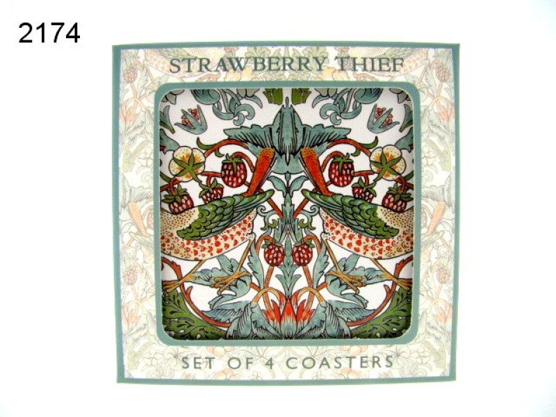 Deze set bestaat uit vier onderzetters, elk versierd met het iconische "Strawberry Thief" patroon van William Morris.