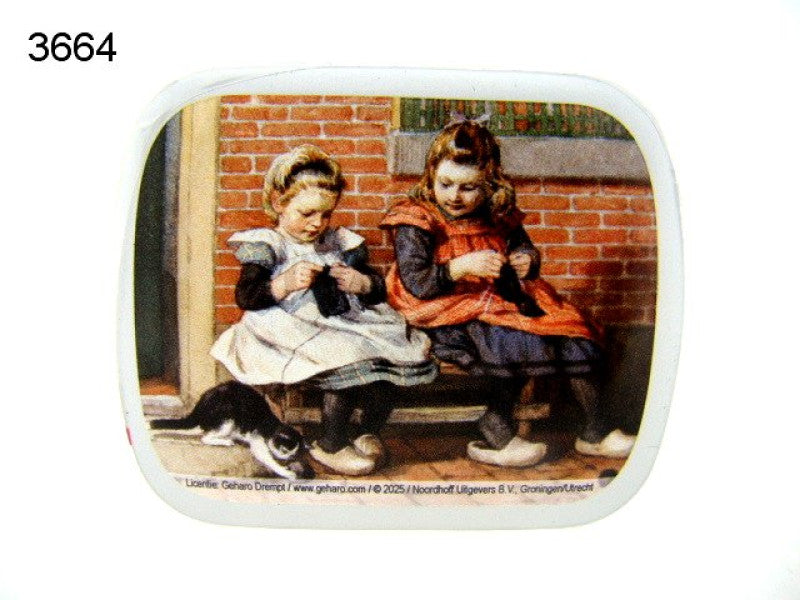 Een decoratief pepermuntblikje met de illustratie ‘Wat doet poes’ van Cornelis Jetses. Een speels en herkenbaar beeld dat nostalgie oproept.