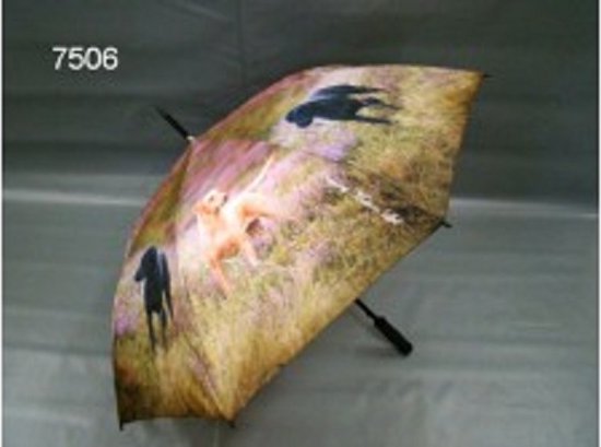Houd jezelf droog tijdens regenachtige dagen met deze vrolijke paraplu, volledig bedrukt met rondom foto’s van een blonde en een zwarte Labrador.
