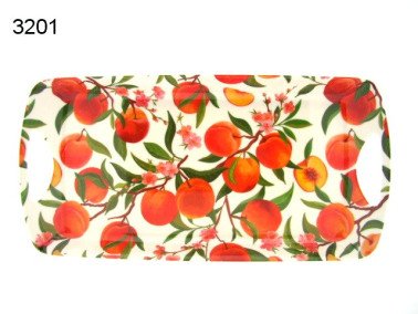 Breng de sfeer van een zonnige boomgaard naar binnen met dit middelgrote dienblad, voorzien van een elegante illustratie van perziken aan de tak, omringd door bloesem. De warme kleuren en fijne details maken het tot een fris en charmant accent op je tafel.