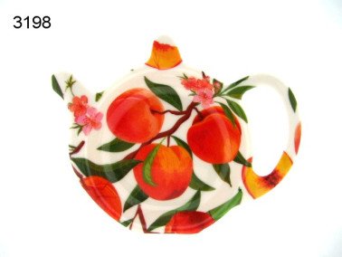 Een klein stukje zomerse fruitpracht voor bij de thee. Deze theetip in theepotvorm toont een sierlijk detail van perziken met bloesem, in zachte tinten roze, oranje en groen. Praktisch om je theezakje op te leggen en een mooie aanvulling op je theeservies.