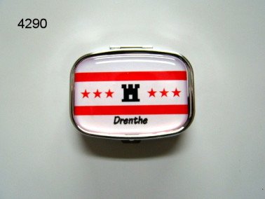 Dit charmante pillendoosje is een prachtig aandenken aan de regio Drenthe. Het doosje is volledig gemaakt van metaal en heeft een scharnierend deksel met een ontwerp van de vlag van Drenthe. De vlag bestaat uit twee horizontale rode strepen aan de boven- en onderkant, met een witte achtergrond ertussen. In het midden van de witte achtergrond staat een zwart kasteeltoren symbool, geflankeerd door vijf rode sterren. Onder de vlag staat trots het woord "Drenthe" geschreven.