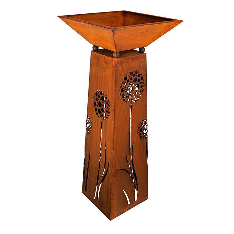 Deze roestkleurige plantenzuil met sierlijk paardenbloemmotief is een echte blikvanger voor tuin, balkon of terras. Ook binnenshuis komt hij prachtig tot zijn recht als woondecoratie met een robuuste, landelijke uitstraling.