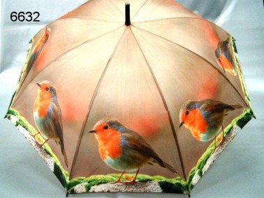 Laat je verrassen door de charme van deze roodborstjesparaplu. Versierd met sfeervolle afbeeldingen van het geliefde roodborstje – symbool van hoop en huiselijkheid – brengt deze paraplu warmte en kleur op regenachtige dagen.