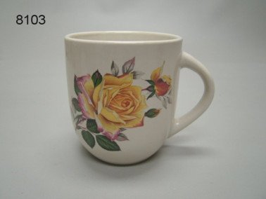 Deze kleine keramische mok is versierd met een prachtig ontwerp van gele rozen en groene bladeren. Met een hoogte van ongeveer 8 cm is deze mok ideaal voor het serveren van warme dranken zoals koffie of thee. De kleurrijke illustratie van rozen voegt een vleugje natuur en charme toe aan je tafelsetting.