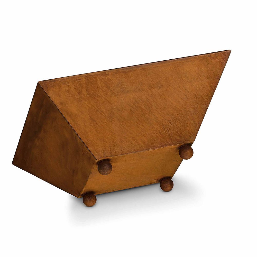 De schaal is handgemaakt van cortenstaal en staat stabiel op vier metalen bollen. De natuurlijke roestafwerking ontwikkelt zich in de loop der tijd verder en zorgt voor een authentieke vintage uitstraling.