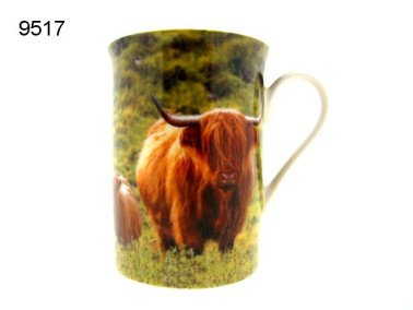 Voeg een vleugje landelijke charme toe aan je theetafel met deze prachtige mok. De mok toont een gedetailleerde afbeelding van twee Schotse Hooglander koeien in een grasveld. De voorste koe heeft een lange, ruige vacht en prominente hoorns, terwijl de tweede koe op de achtergrond te zien is. Dit unieke ontwerp straalt een authentieke Schotse sfeer uit en is perfect voor koffie- of theeliefhebbers.