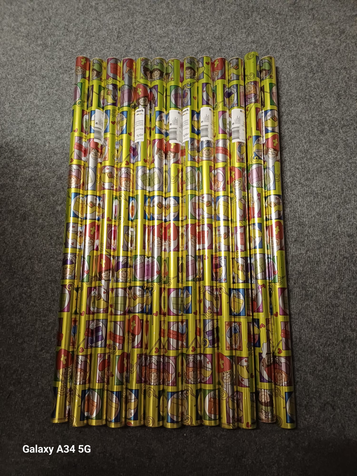 Surprise in stijl Rol van 70 x 200 cm, glossy kwaliteit. Gele basis met speelse tekeningen van Sinterklaas, Piet en stapels cadeautjes. Ideaal voor het inpakken van surprises en geschenken.