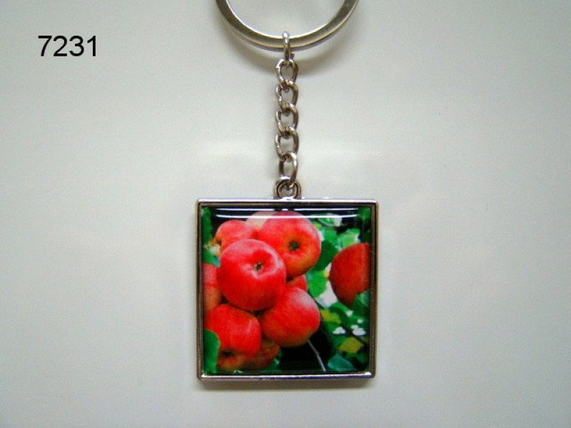 Deze charmante sleutelhanger heeft een vierkante hanger van 4 x 4 cm, met een kleurrijke afbeelding van meerdere rode appels aan een boom met groene bladeren. De sleutelhanger is bevestigd aan een stevige metalen ketting en ring, waardoor hij perfect is voor het veilig bewaren van je sleutels. Het levendige ontwerp maakt het niet alleen een praktische accessoire, maar ook een decoratief item dat je dagelijks kunt gebruiken. Ideaal als cadeau of als een leuke toevoeging aan je eigen sleutels.