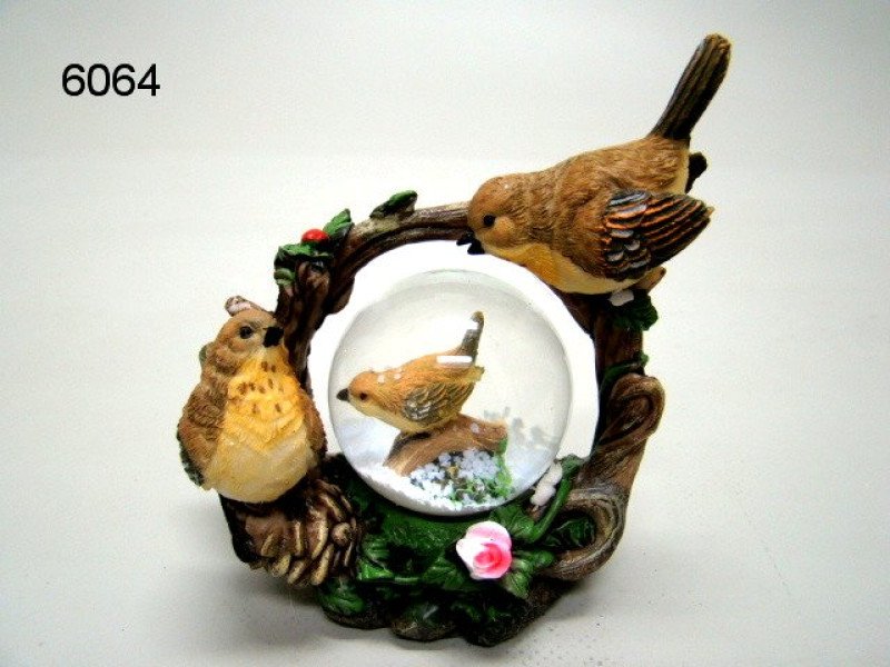 Een charmante schudbol met een speels ontwerp: twee vogeltjes zitten op de houder, terwijl één vrolijk vogeltje binnenin de bol lijkt te dansen. Met een doorsnede van 4,5 cm en een totale hoogte van circa 7 cm brengt dit sierlijke decoratiestuk een levendige en vrolijke sfeer in huis.