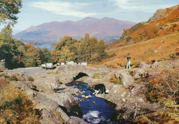Ervaar de rust en schoonheid van het Engelse platteland met de HOP Legpuzzel – Thirsty Work! Deze prachtige foto toont twee Border Collies in een schilderachtig, rotsachtig landschap met een kabbelend stroompje. Over het water ligt de iconische Ashness Bridge, een historische stenen brug in het adembenemende Lake District. Op de brug trekt een kudde schapen rustig voorbij, terwijl een van de honden slim van de gelegenheid gebruikmaakt om wat verkoeling te zoeken en water te drinken.