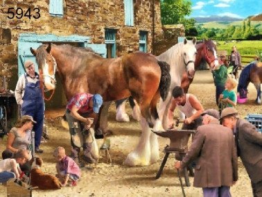 Time for New Shoes toont een fascinerend en gedetailleerd moment van vakmanschap, waarin hoefsmeden druk bezig zijn met het beslaan van een paard. De hoefsmeden werken zorgvuldig en geconcentreerd, met hun gereedschap in de hand, terwijl het paard geduldig staat en af en toe een nieuwsgierige blik werpt op de mannen die hun werk doen.