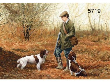 De wenskaart Under Orders toont een jager, gekleed in een traditionele outfit, staande met zijn twee honden aan zijn zijde. De honden, Engelse Springer Spaniels, zitten geduldig en alert, klaar om hun taak uit te voeren. De jager kijkt naar voren, met een rustige en vastberaden houding, wachtend op het juiste moment om zijn bevelen te geven. Het landschap rondom hen is weids en open, met een subtiele verwijzing naar het platteland of een bosrijke omgeving. De scène straalt kalmte en discipline uit, waarbij de verbinding tussen de jager en zijn honden duidelijk wordt. Deze kaart is perfect voor degenen die van de jachttraditie houden of de diepe band tussen jagers en hun honden waarderen