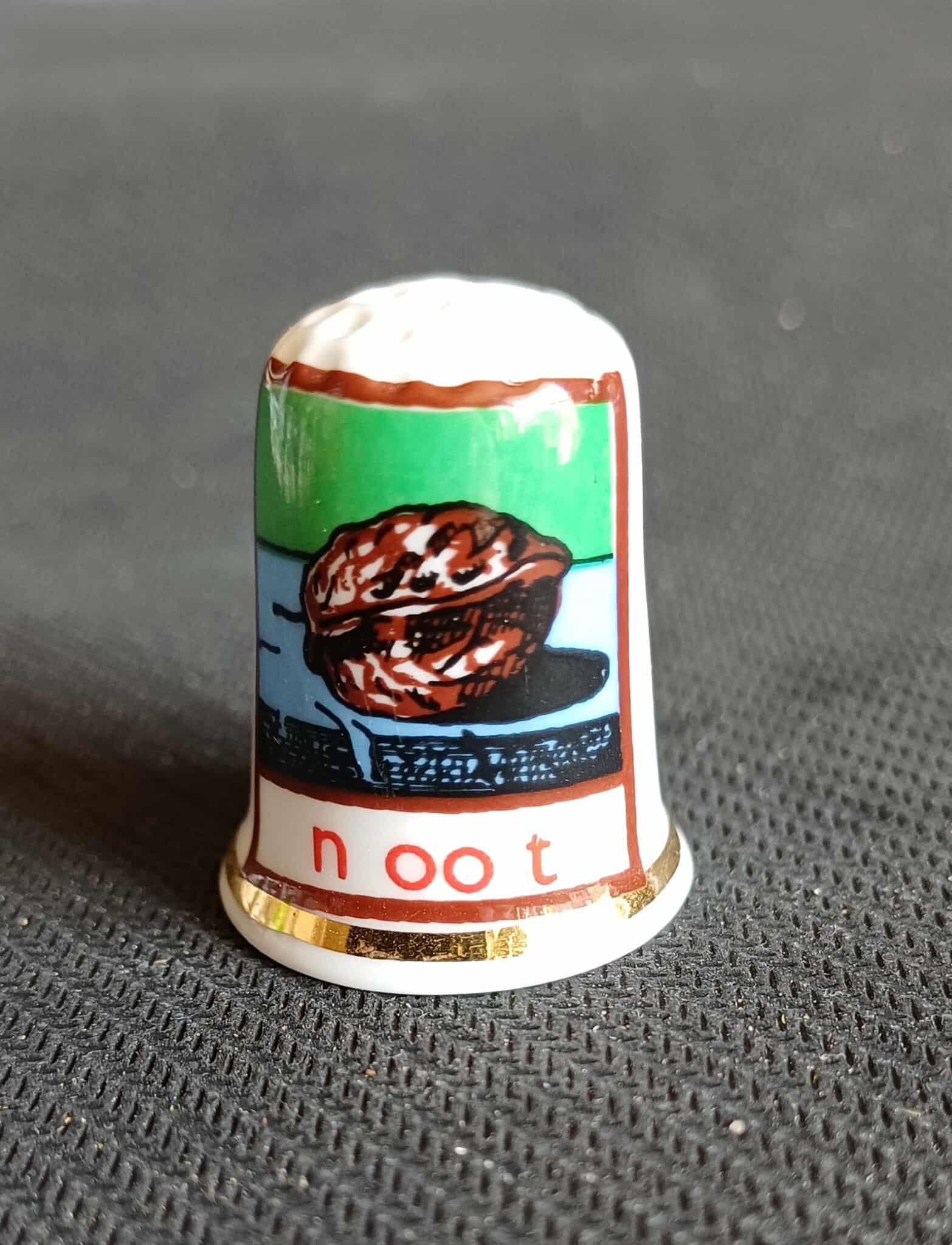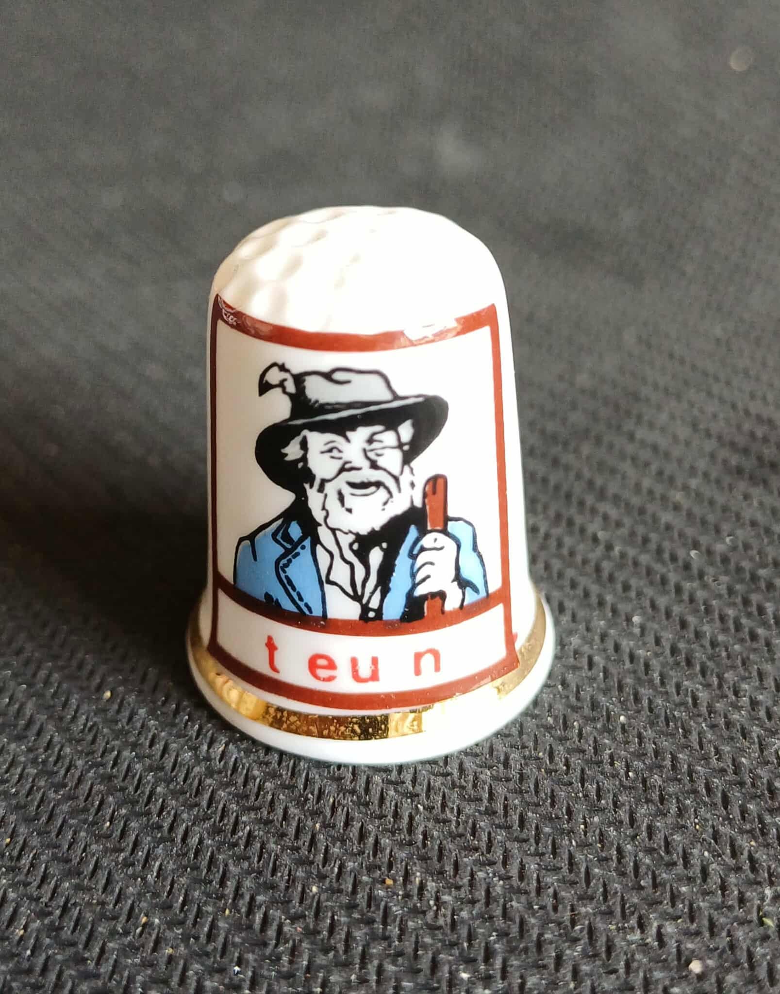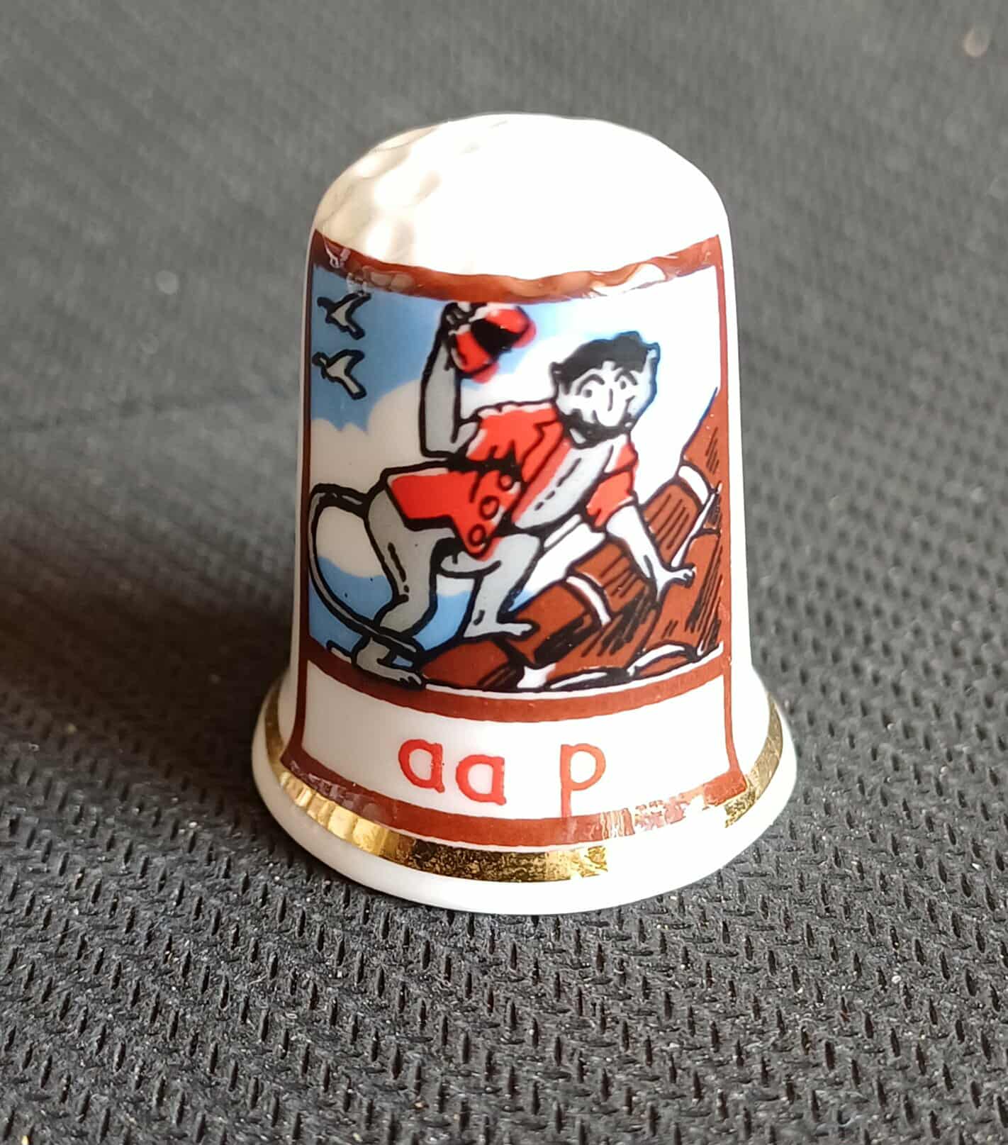 Dit prachtige vingerhoedje, gemaakt van fijn keramiek, is versierd met de iconische Aap, Noot, Mies illustraties, die generaties kinderen hebben geholpen leren lezen. Het vingerhoedje is een prachtig decoratief stuk en een uniek verzamelobject. De levendige kleuren en de bekende afbeeldingen voegen een vleugje nostalgie toe aan je verzamelcollectie. Ideaal voor liefhebbers van retro designs en als een bijzonder cadeau.