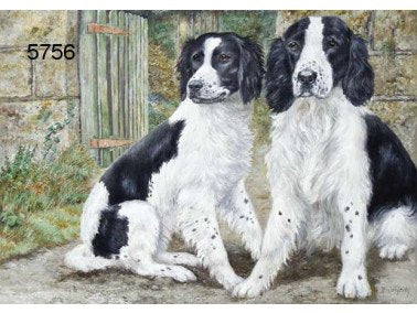 De wenskaart Waiting toont twee Springer Spaniels die geduldig zitten te wachten bij een stenen muurtje, met een open, houten tuinpoort op de achtergrond. De honden, met hun typische lange oren en energieke uitstraling, kijken beide in de richting van de weg, als wachtend op een signaal om verder te gaan. Het stenen muurtje voegt een rustieke charme toe aan de scène, terwijl de open tuinpoort uitnodigt naar het onbekende, wat het gevoel van verwachting en spanning versterkt. De omgeving heeft een rustige, landelijke uitstraling, met gras dat de poort omringt. Deze kaart straalt een serene sfeer van geduld en loyaliteit uit, perfect voor hondenliefhebbers die de speelse, geduldige aard van Springer Spaniels waarderen.