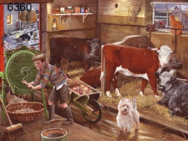 Een warme, nostalgische puzzel met een winters tafereel. Op de afbeelding zie je een jongen die in de stal het vee voert. Terwijl buiten de sneeuw ligt, brengt dit tafereel de sfeer van eenvoud en gezelligheid naar binnen.