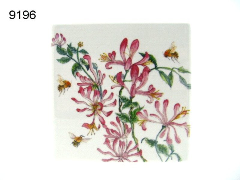 Deze onderzetter heeft een prachtige botanische illustratie van kamperfoeliebloemen en bijen. De bloemen zijn afgebeeld in prachtige roze en rode tinten met groene bladeren, en er vliegen meerdere bijen omheen. Deze onderzetter is zowel functioneel als decoratief en voegt een vleugje natuur toe aan je tafel.