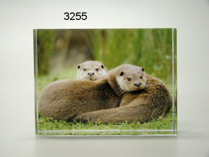 Een stijlvol glasblokje met een ingegraveerde afbeelding van een otter. Het blokje is subtiel van formaat en heeft een kleurrijk effect dat het geheel een extra levendige uitstraling geeft. Perfect als klein kunstwerkje op een bureau, vensterbank of in een vitrine.