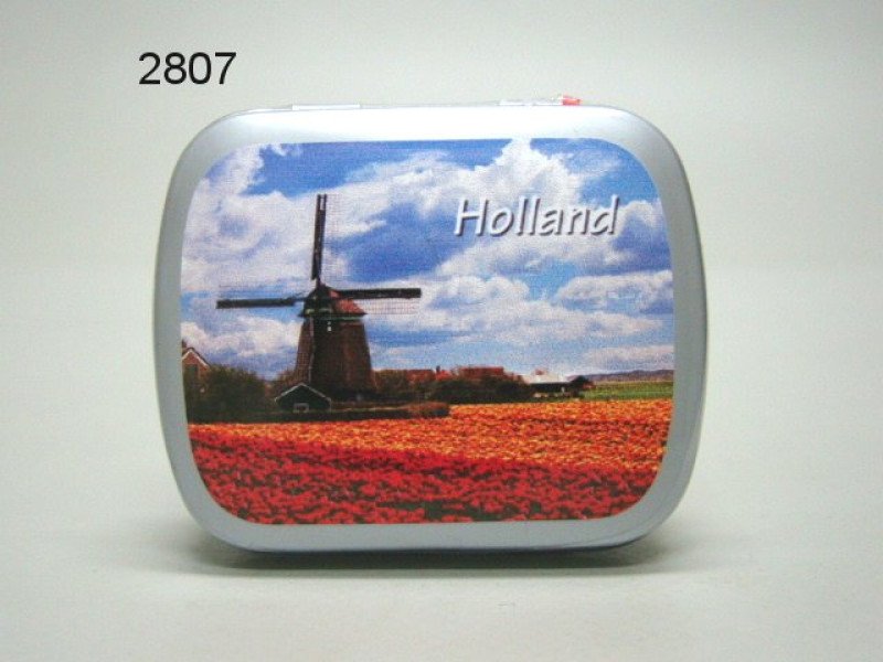 Leuk blikje met ca 14 gram kleine pepermuntjes. De afmeting van het blikje is 6 x 5 x 1,5 cm.