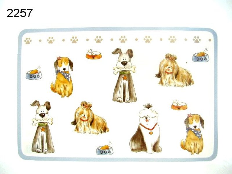 De placemat is bedrukt met grappige, cartooneske afbeeldingen van honden en zorgt direct voor een glimlach.
