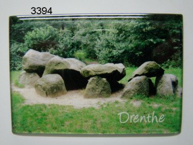 Deze rechthoekige magneet is een prachtig aandenken aan de regio Drenthe. De magneet toont een sfeervolle afbeelding van een hunebed, een type prehistorisch grafmonument dat kenmerkend is voor Drenthe. Het hunebed bestaat uit grote, op elkaar gestapelde stenen, gelegen in een groene, natuurlijke omgeving. Onder de afbeelding staat trots het woord "Drenthe" geschreven in witte tekst.