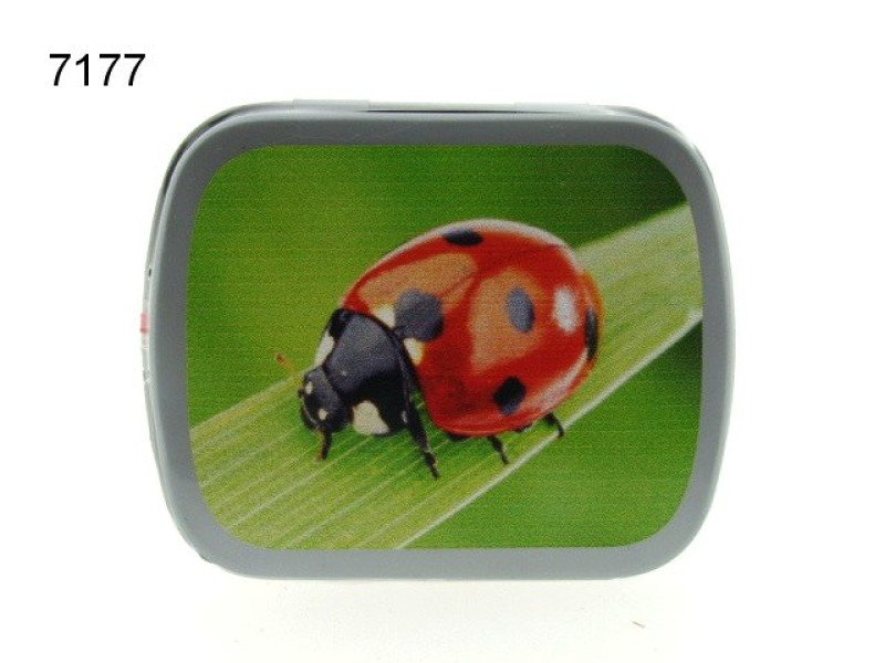 Leuk blikje met ca 14 gram kleine pepermuntjes. De afmeting van het blikje is 6 x 5 x 1,5 cm.