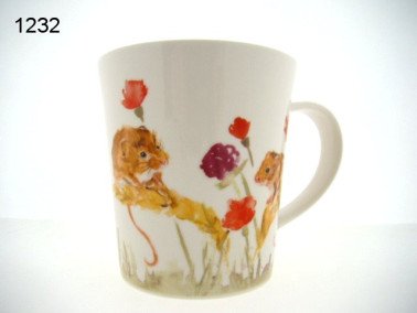 Afmetingen: Ongeveer 250 ml inhoud Materiaal: Keramiek Design: De mok heeft een kleurrijke illustratie van twee muizen tussen bloemen, waaronder rode en paarse bloesems. Het ontwerp is geschilderd in een aquarelstijl, wat het een zachte en artistieke uitstraling geeft.