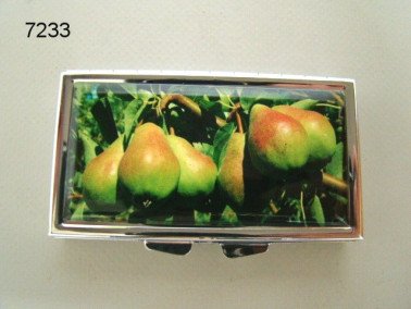 Dit handige pillendoosje is gemaakt van metaal en heeft drie vakken voor het opbergen van pillen of supplementen. Het doosje meet 8 cm bij 4,5 cm en heeft een scharnierend deksel. Op het deksel staat een kleurrijke afbeelding van meerdere peren aan een boomtak, afgedekt met een laagje polyresin voor extra duurzaamheid en een aantrekkelijke uitstraling. Het compacte formaat en de stijlvolle afbeelding maken dit pillendoosje zowel praktisch als esthetisch aantrekkelijk.